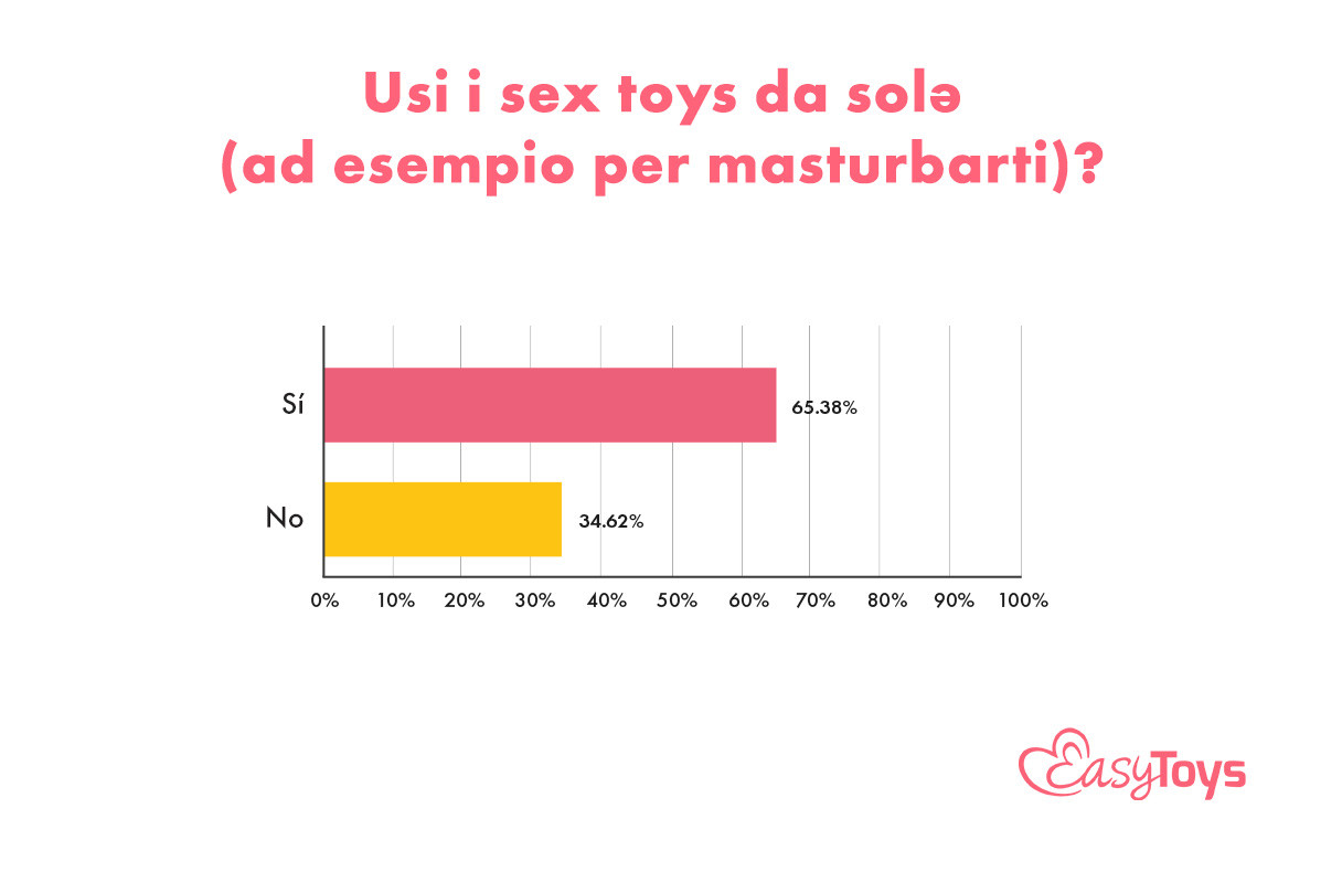 Il 65,38% ha risposto che usa un sex toy per masturbarsi (da solo). Mentre il 50,92% usa un sex toy con il partner. Tra i preferiti da usare in coppia ci sono i vibratori, seguiti dai toys anali e dai dildo.
