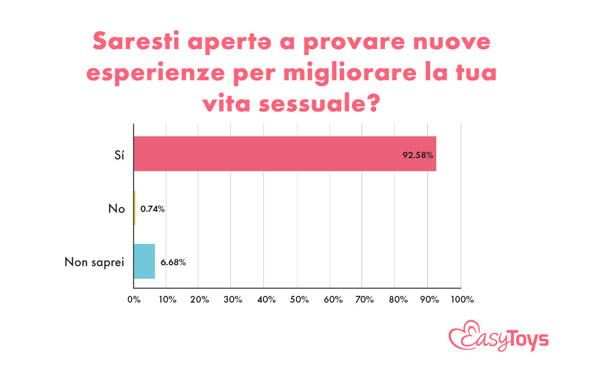 Da un sondaggio anonimo condotto recentemente da EasyToys Italia è emerso che i sextoys stanno diventando sempre più popolari in camera da letto. Gli italiani sono amanti appassionati che godono di una vita sessuale sana e attiva. Non hanno paura di sperimentare e sono aperti a provare cose nuove. Lo studio ha intervistato 1.000 italiani di età compresa tra i 18 e i 64 anni sulla loro vita sessuale.